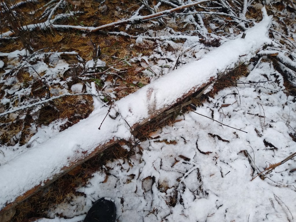 A scuff mark on the log, from where a deer brushed again it in the snow.