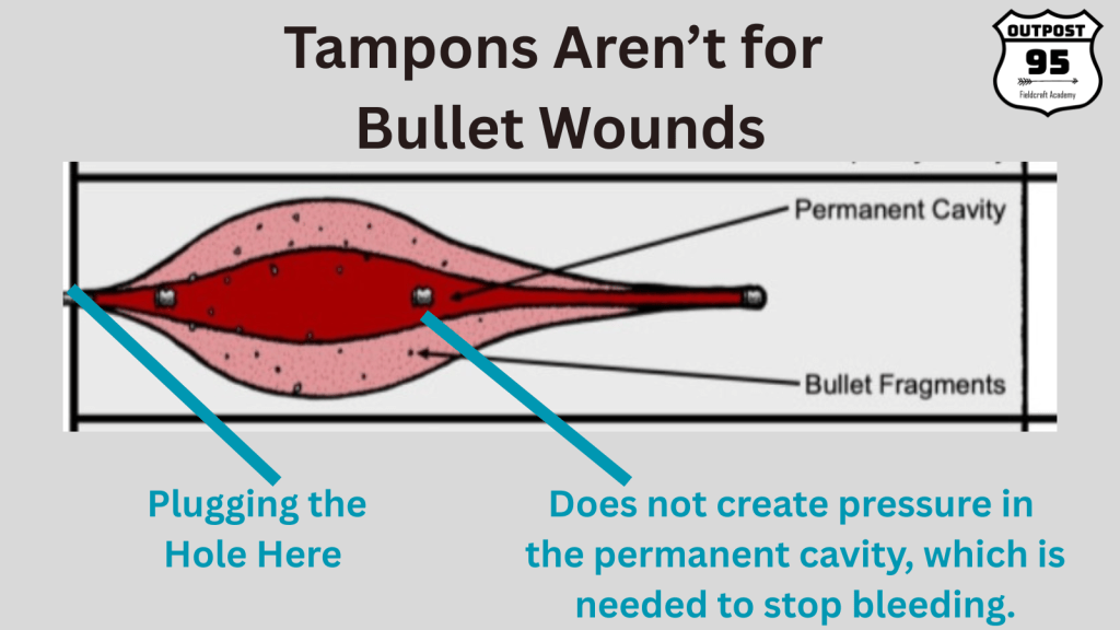 A bullet hole will sometimes have a small entrance wound, followed by a rather large wound cavity. If you put a cork in the entrance wound, a cork is all the tampons is, then the wound will continue to bleed internally. Because there is a new, rather large permanent wound cavity, there can be a massive amount of bleeding before the volume of blood pushes the proverbial cork out.
